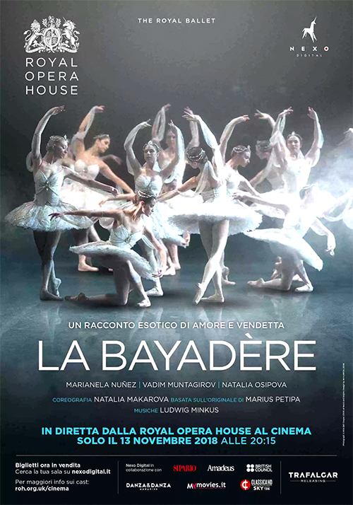 Trama: Ambientata in un'India leggendaria, La Bayadère racconta la storia di una danzatrice del tempio e del principe che, pur amandola, sposa un'altra donna. Il famoso “atto bianco” illuminato dalla luna – Il regno delle ombre – è uno dei momenti salienti creati dal corpo di ballo: qui la mente del principe viene perseguitata dalle immagini del suo amore perduto. Nella coreografia spiccano due ballerine contrapposte, mentre un idolo di bronzo prende vita in un sorprendente assolo...