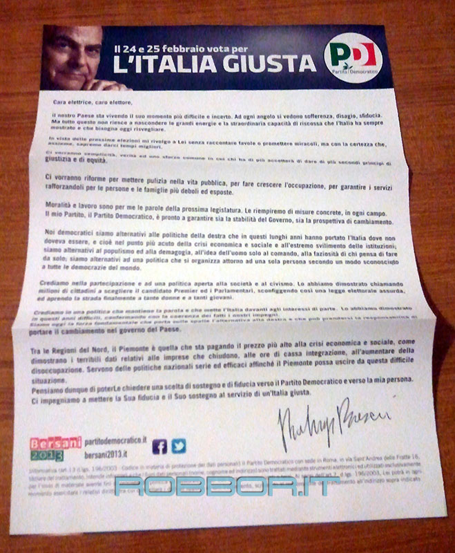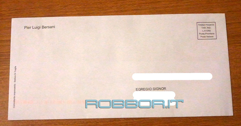 Oggi ho ricevuto una lettera (la busta era nominativa) nientepopodimeno che da Pier Luigi Bersani.