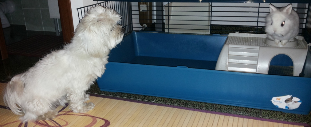 La gabbia di Bunny era aperta e lui stava sulla cuccetta nel posto in cui di solito gli mettono una sorta di crocchette. Ice prima lo osservava da lontano, poi si è avvicinato e quando mia cognata ha preso le crocchette di Bunny... che scena! Ice ha iniziato ad abbaiare e a fare i giri su se stesso come quando danno da mangiare a lui.