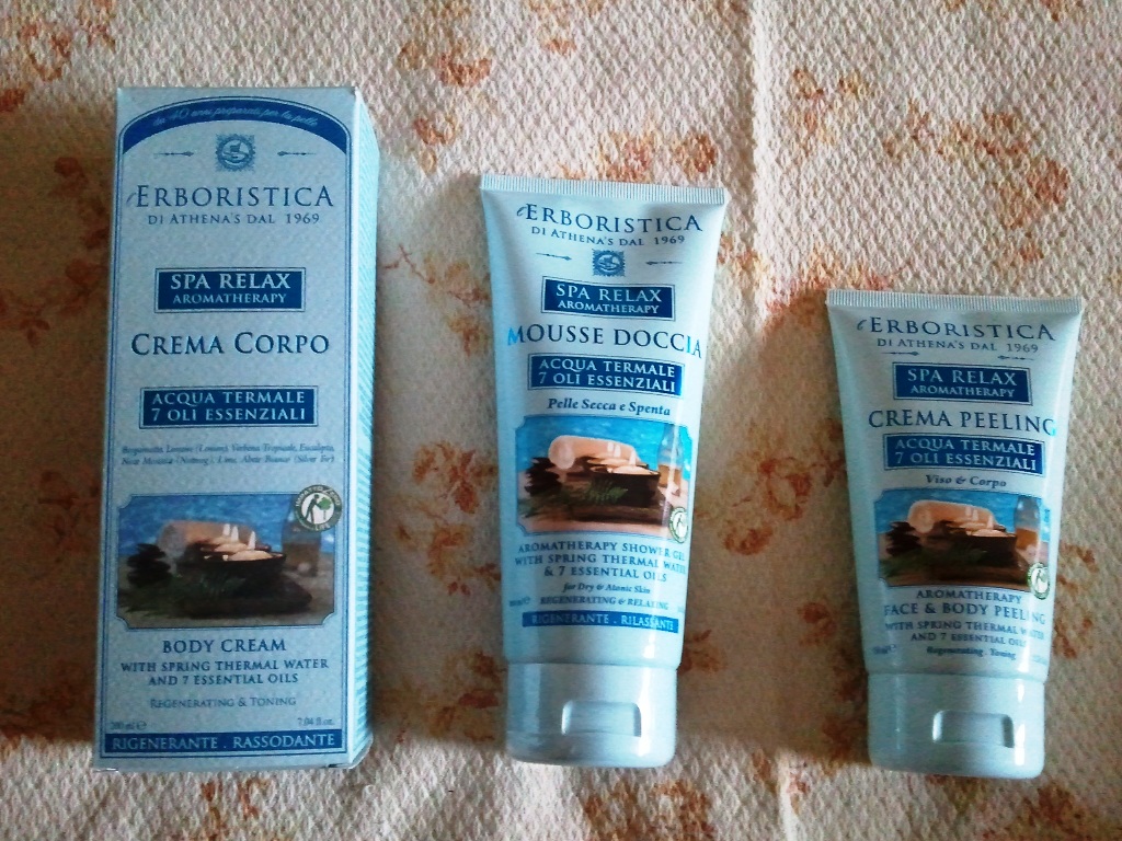 L'Erboristica SPA RELAX AROMATHERAPY che mi ha regalato l'Amica che mi aveva comprato già il vestito (che ancora non vi mostro: lo farò appena sarà il momento di indossarlo) insieme al fidanzato. Crema peeling, crema corpo e mousse doccia.