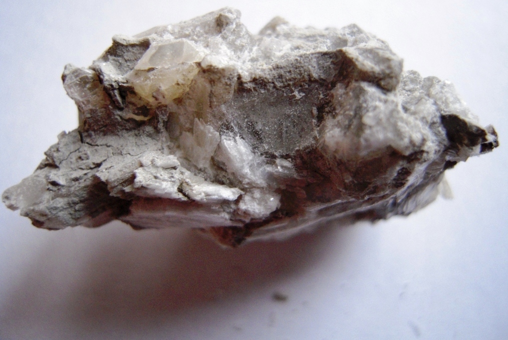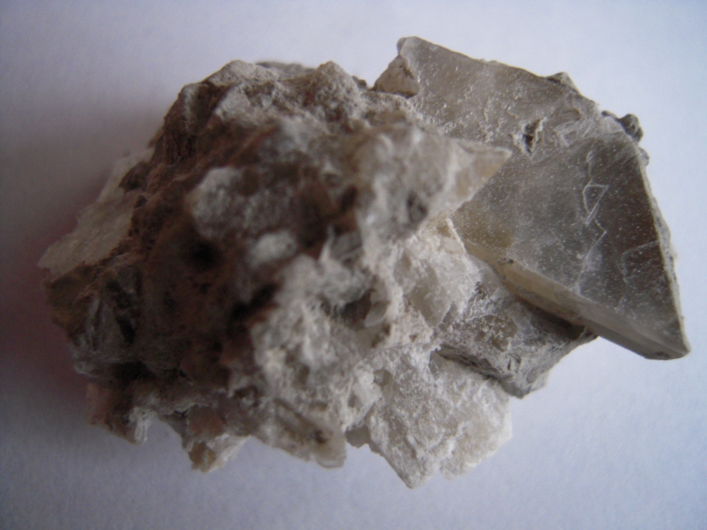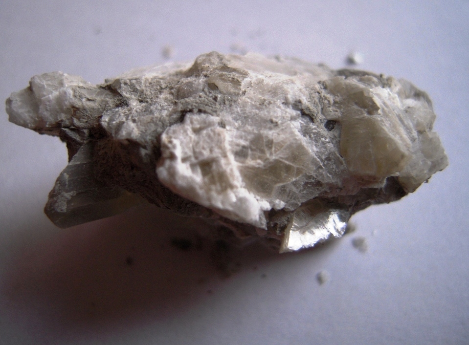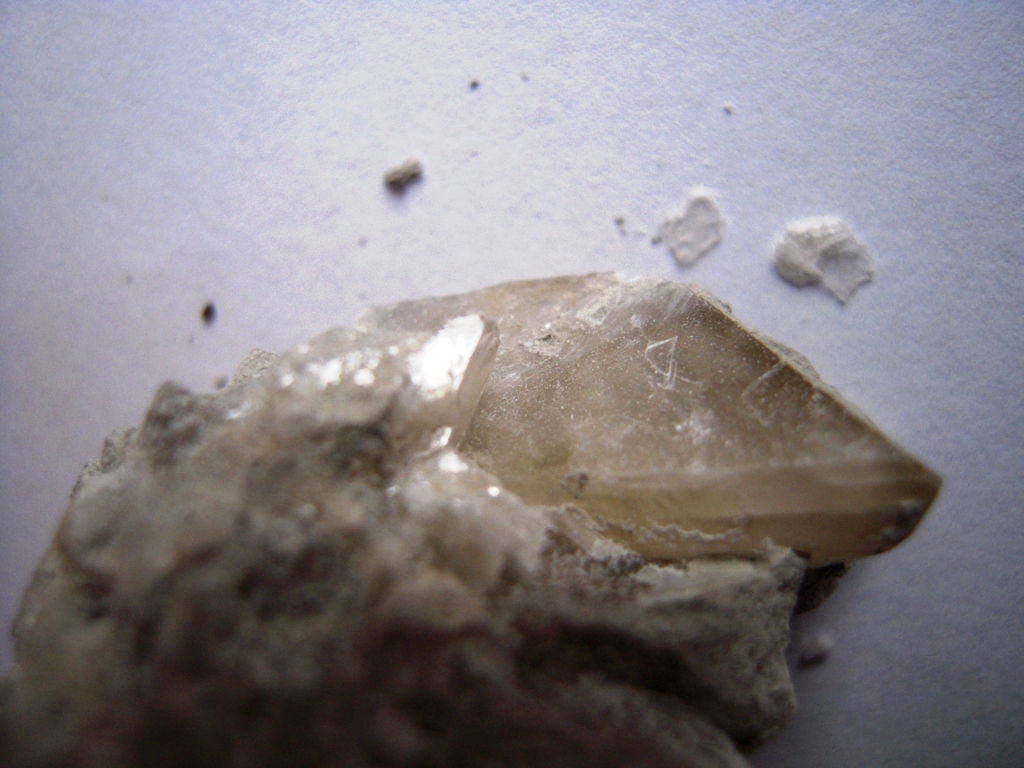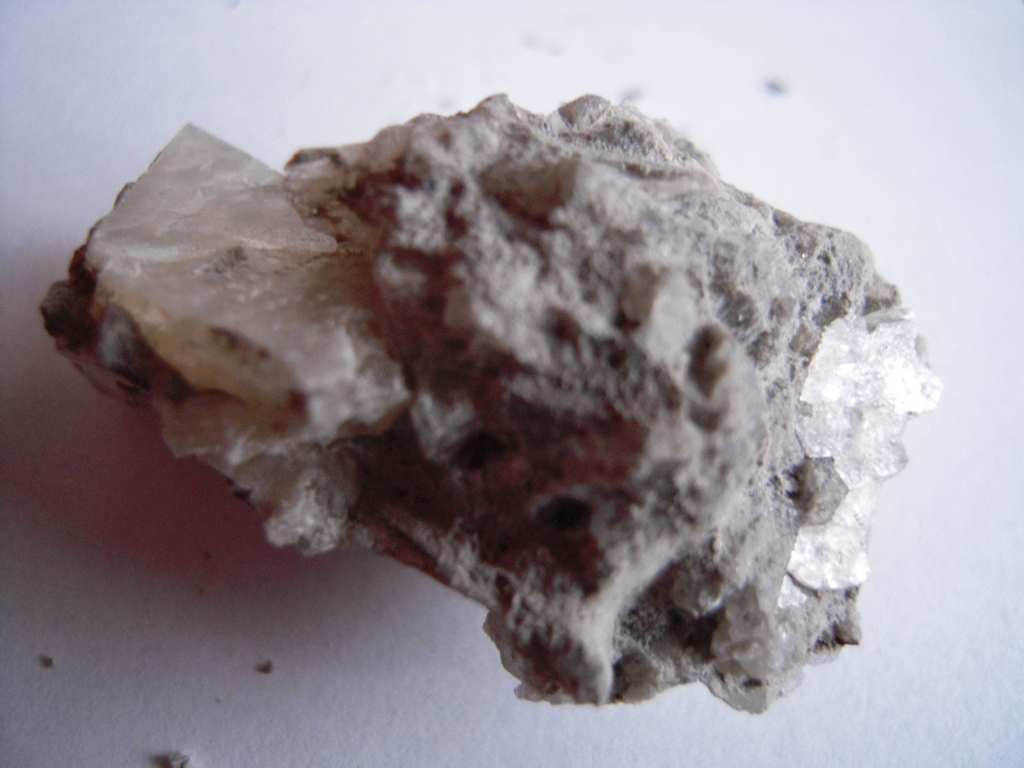 Alcuni giorni fa sono stata l'intera giornata nelle provincia di Alessandria e per non congelare ogni tanto era necessario fare delle brevi passeggiate; anche la geologa che aveva viaggiato con me ogni tanto si spostava alla ricerca di pietre da aggiungere alla sua già ampia collezione. Quel giorno ha trovato una roccia con un fossile e un pezzo di marna (calcare misto ad argilla) con cristalli di gesso. La marna tiene insieme i cristalli di gesso, ma occorre essere molto delicati per evitare la rottura della roccia lungo determinati piani, così in fase di preparazione dei "souvenir" per il trasporto si è rotto un pezzetto di marna con cristalli di gesso e mi è stato regalato.