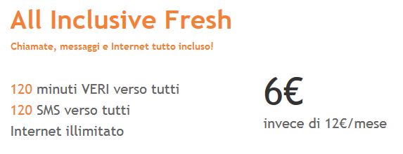 Con All Inclusive Fresh di Wind si hanno 120 minuti verso tutti, 120 SMS verso tutti e Internet illimitato a 6 € al mese invece di 12 €/mese. I minuti inclusi sono "veri" perchè conteggiati per ogni secondo di effettiva conversazione.